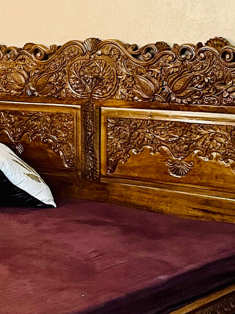 Deep engraved mix of almond & poshkaar hand carving, walnut king size low profile bed.